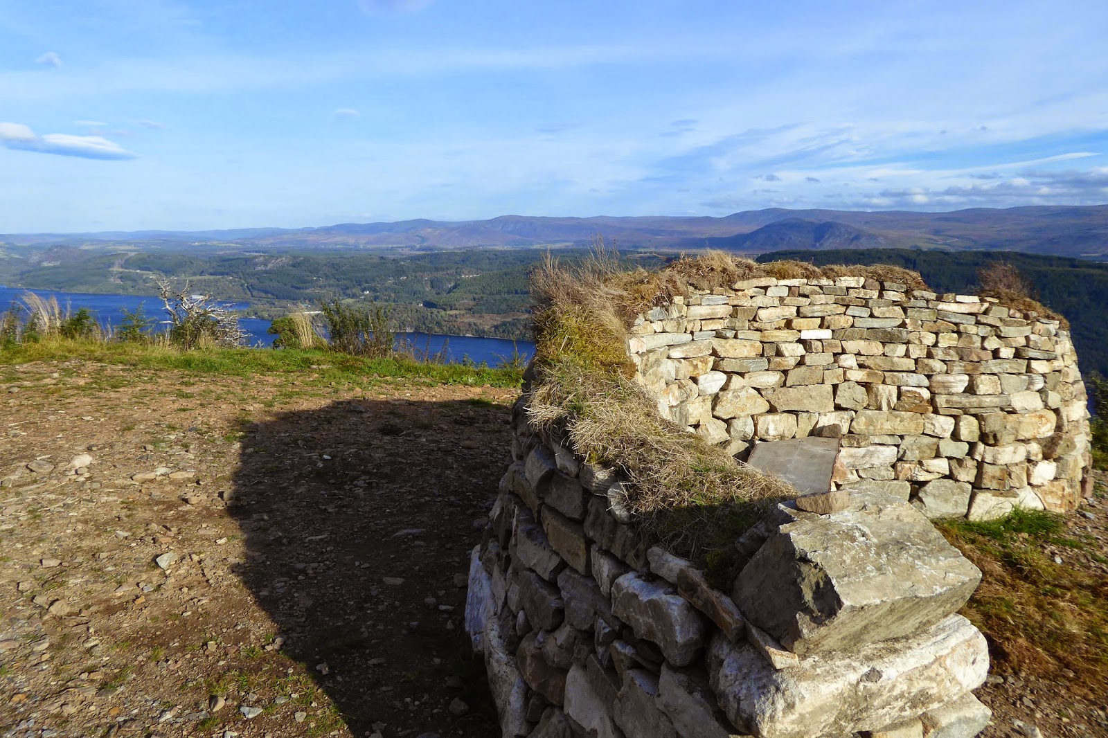 On the high route there were a couple of shelters.  This is an S shaped one and so walkers can get out of the wind and admire the view on one side or the other.  Loch Ness is in the background.